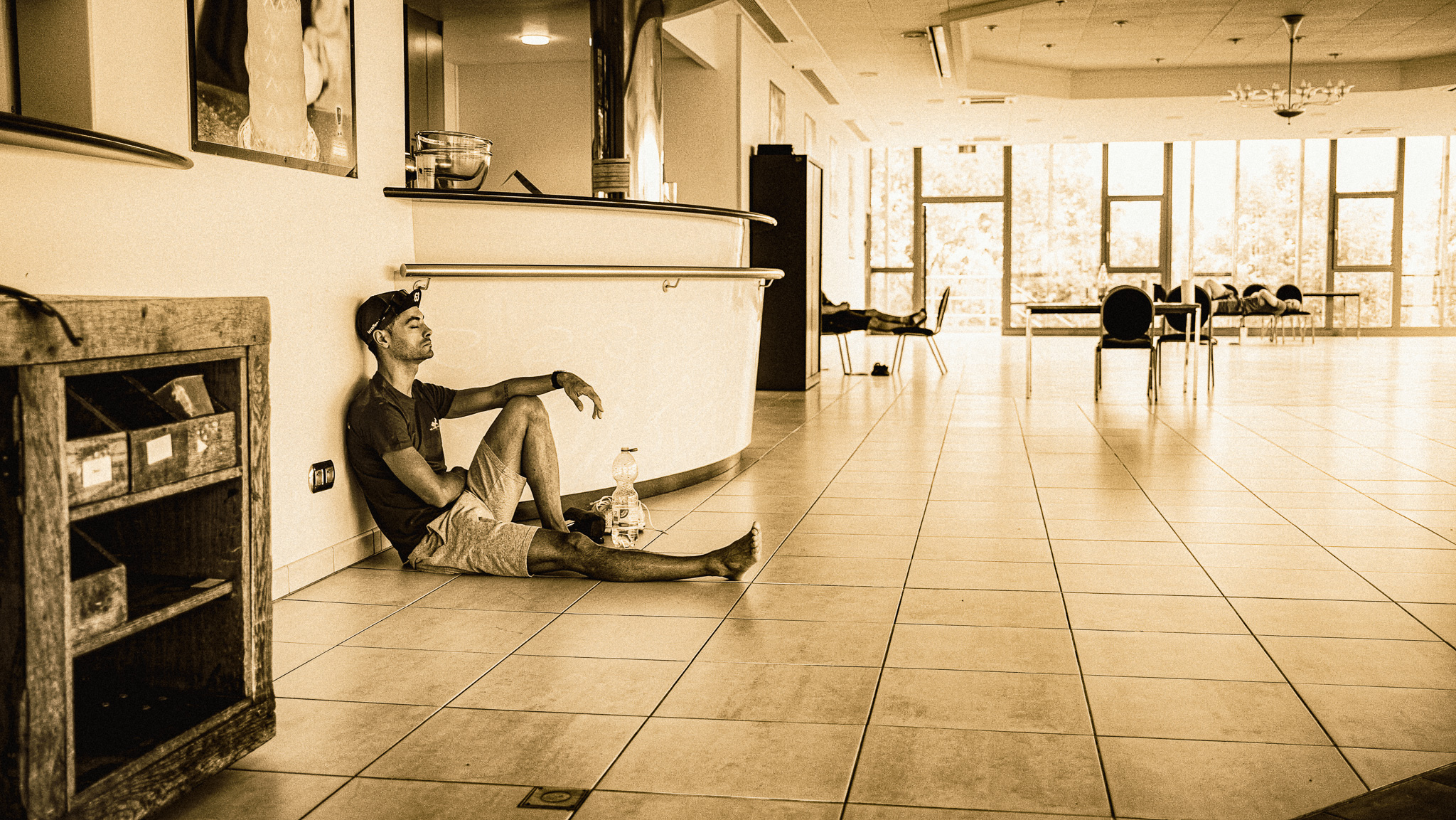Vooraf moest ik een tijdslot reserveren om me aan te melden en de verplichte fietscheck te laten doen. Ik werd om 15.30 uur verwacht voor de check, maar was al om 15.15 uur klaar, wat me zeeën van tijd gaf om nog even te rusten voor de start. Een iets te diepe zee, en vooral een heel warme zee, want het was bloedheet die dag. In de ruimte waar we konden wachten, was het zeker 35 °C en daar heb ik het wel wat lastig mee. Ik moest al voldoende hydrateren in de rustfase om de krampen alvast voor te zijn.
